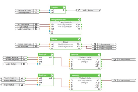 Youless is verbonden met de slimme meter via de P1 poort. Door de koppeling met de slimme meter kan er een onderscheid gemaakt worden tussen leveren en verbruik, ook is er een onderscheid tussen dal en piek verbruik. Hierdoor kunnen we een eenvoudige installatie realiseren. Via een RS485 interface lezen we de waarde van het PV systeem met batterij pakket uit. Koppeling is in de bouwsteen mogelijk voor Fronius en Kostal.
