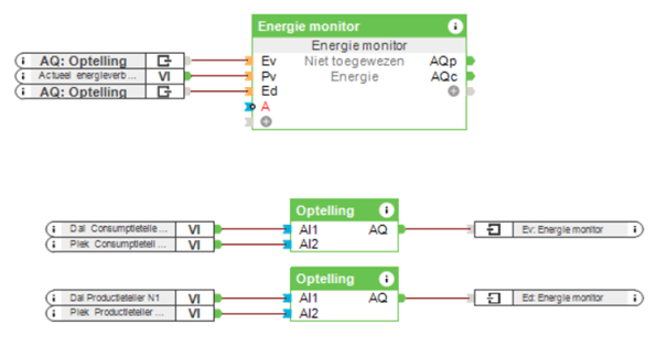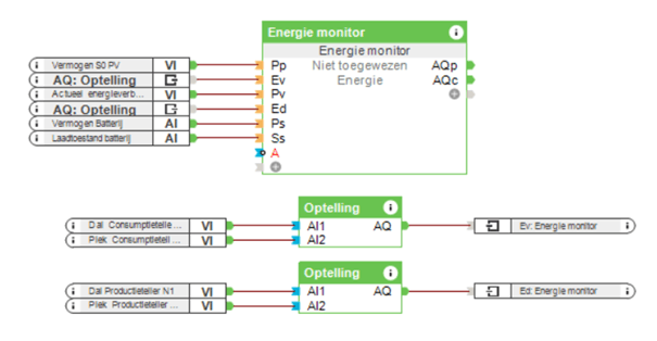 Youless is verbonden met de slimme meter via de P1 poort, de S0 poort is verbonden met de S0 teller. Door de koppeling met de slimme meter kan er een onderscheid gemaakt worden tussen leveren en verbruik, ook is er een onderscheid tussen dal en piek verbruik. Hierdoor kunnen we een eenvoudige installatie realiseren. S0 meter meet de productie van zonne-energie en de batterij waarden worden via RS485 uitgelezen.