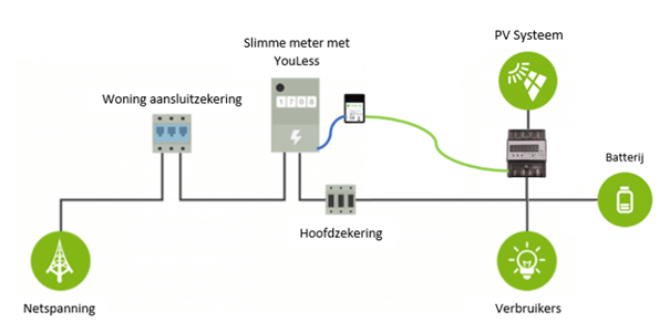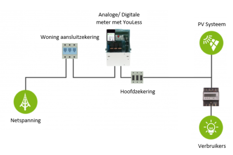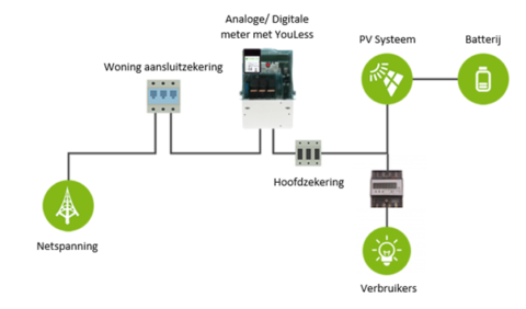 Youless is verbonden met de slimme meter via de P1 poort, de S0 poort is verbonden met de S0 teller. Door de koppeling met de slimme meter kan er een onderscheid gemaakt worden tussen leveren en verbruik, ook is er een onderscheid tussen dal en piek verbruik. Hierdoor kunnen we een eenvoudige installatie realiseren. De S0 teller meet de stroomproductie van de PV installatie.