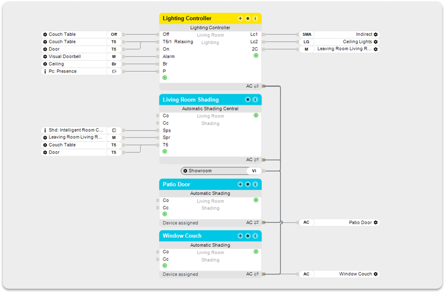 Opmerking: gebruik slechts één functiebouwsteen en meng ze niet met elkaar. Voor bijvoorbeeld zonwering gebruik je ofwel de functiebouwstenen Automatische Zonwering, Automatische Zonwering Geïntegreerd, of Automatische Zonwering Centraal.