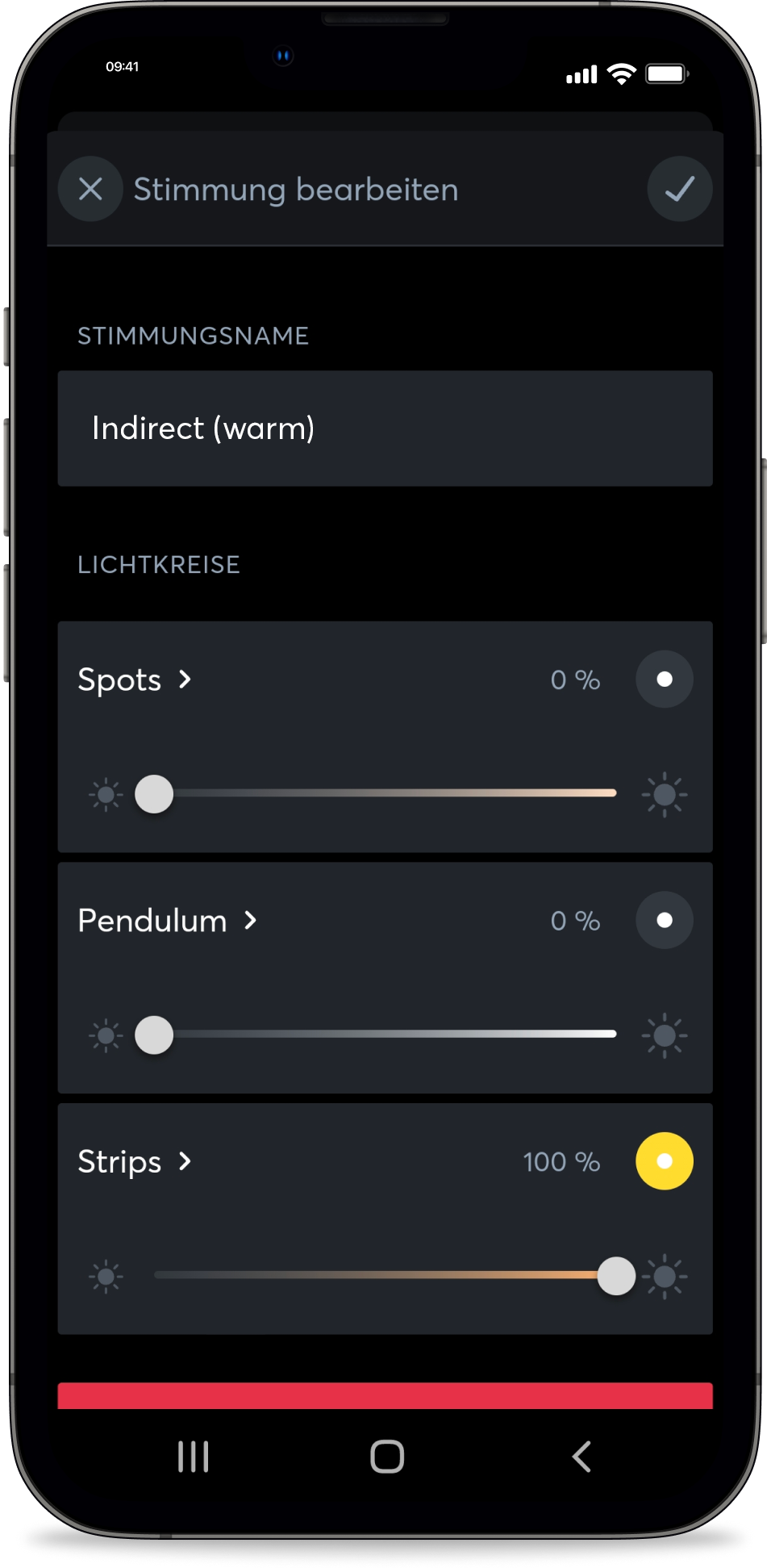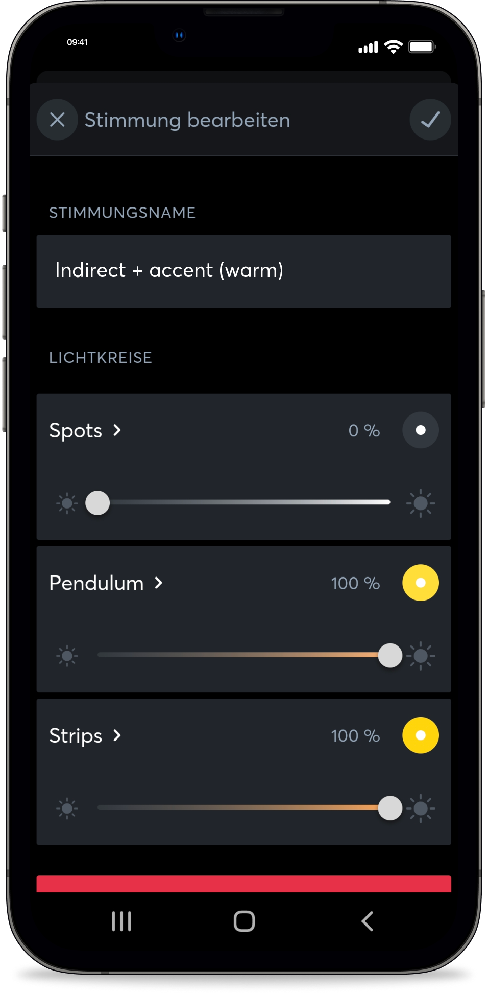 Wij raden verschillende lichtstemmingen aan, bijvoorbeeld LED-spots RGBW voor basisverlichting, LED Pendulum Slim voor accentverlichting en RGBW LED-strips voor indirecte verlichting.