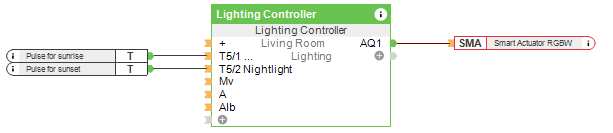 De verlichting wordt geregeld door middel van de lichtsturingsbouwsteen. De impulsen ‘zonsondergang’ en ‘zonsondergang’ veranderen de stemming.