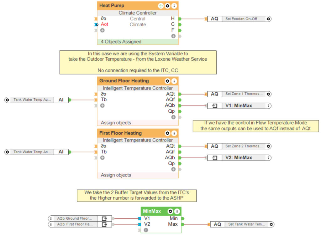 Als jouw klant een lucht-water warmtepomp heeft, kunnen we deze verder optimaliseren op basis van de informatie die door het Loxone systeem wordt gegeven. Zo kunnen we bijvoorbeeld de doelstroomtemperaturen van het warme water en de doeltemperatuur van het buffervat instellen op basis van de vraag van het systeem en de buitentemperatuur om de pomp efficiënter te laten werken. In wezen is het het vermogen om al deze gegevenspunten te lezen (temperatuur en grootte van elke kamer, de buitentemperatuur, de stroomtemperatuur) dat een systeem zoals Loxone in staat stelt om een zoneverwarmingssysteem op de meest energie-efficiënte manier te beheren. Het is de kracht van de software en de berekeningen die achter de schermen plaatsvinden die de meest optimale oplossing leveren voor zoneverwarmingscontrole.