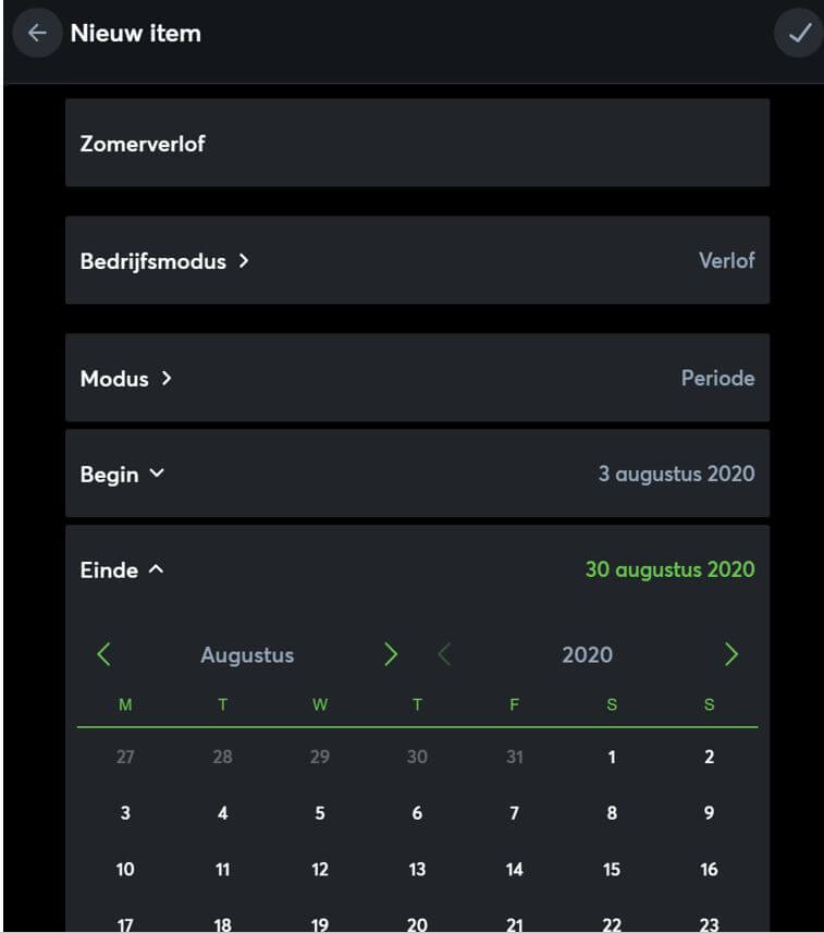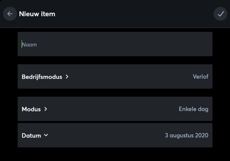 Met de witte ‘V’ rechtsboven kan je de aangemaakte bedrijfstijd aanmaken.