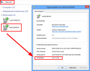 Als u het IP-adres niet kent, kunt u dit terugvinden in de netwerkomgeving van uw pc. In de categorie Multimedia vindt u het item “MUZIEKSERVER”. Door rechts op het pictogram te klikken, kunt u de eigenschappen openen, waar u het IP-adres kunt zien.