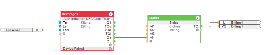 Het functieblok “Machtiging NFC Code Touch” is verbonden met de statusbouwsteen. De uitgang TQu definieert de gebruikers-ID, TQo het geselecteerde product en TQt de tijdstempel. De statusbouwsteen vat deze informatie samen en registreert deze op de SD-kaart van de Miniserver. Daarnaast wordt de informatie via een virtuele uitgang geleverd aan een http-server. Op deze http server wordt dan de facturatie gedaan.