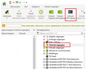 Eerst moet een “virtuele UDP-ingang” worden aangemaakt. Klik daartoe in de periferieboom op “Virtuele ingangen”. Daarna verschijnt een knop “Virtuele UDP-ingang”: