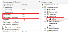Voor elke gebruiker kan een willekeurig wachtwoord worden ingesteld. Daartoe selecteert u in de periferieboom de gebruiker in kwestie en voert u de visualiseringscode in bij de eigenschappen.