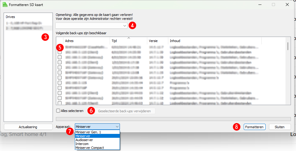 7. Hier selecteer je welke firmware voor welk apparaat naar de SD-kaart geschreven moet worden. Het is zeer belangrijk dat je hier het juiste apparaat kiest. Een Miniserver Compact firmware zal bijvoorbeeld niet werken op een gewone Miniserver.