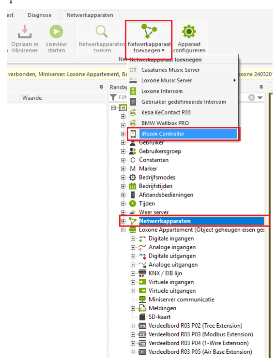 Om een iRoom Controller in te voegen, selecteert u eerst de regel “Netwerkapparaten” in de periferieboom. Vervolgens verschijnt rechtsboven de knop “Netwerkapparaten toevoegen” Door hierop te klikken, verschijnt een keuzemenu waar u de iRoom Controller kunt selecteren en invoegen.