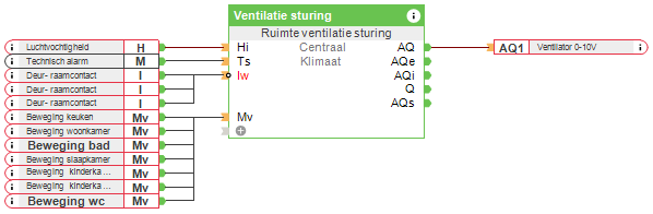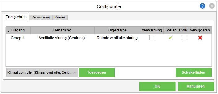 De overeenkomstige Config-bouwsteen “Ventilatie sturing” kan worden geselecteerd als een koelbron door te dubbelklikken op de Intelligente ruimteregeling.