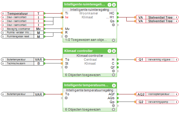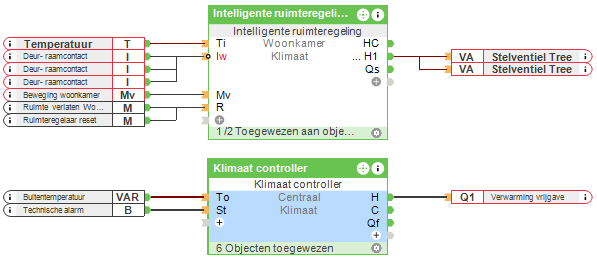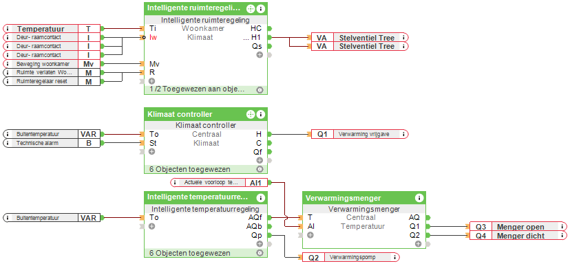 In dit uitbreidingsniveau wordt de vraag naar verwarming en / of koeling van het hele gebouw bepaald met behulp van de klimaatcontroller bouwsteen. De bouwsteen bepaalt nu of de prioriteit verwarmen of koelen is. Zelfs als u geen actief koelsysteem hebt, bepaalt de klimaatregelaar of de verwarmingsbron moet worden in- of uitgeschakeld.