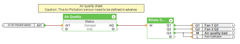 Er is ook een ventilatiesysteem ‘Ventilator 1 Q1’, ‘Ventilator 2 Q2’ die de luchtkwaliteit regelt door middel van een luchtvervuiling sensor S1 (0-10V).