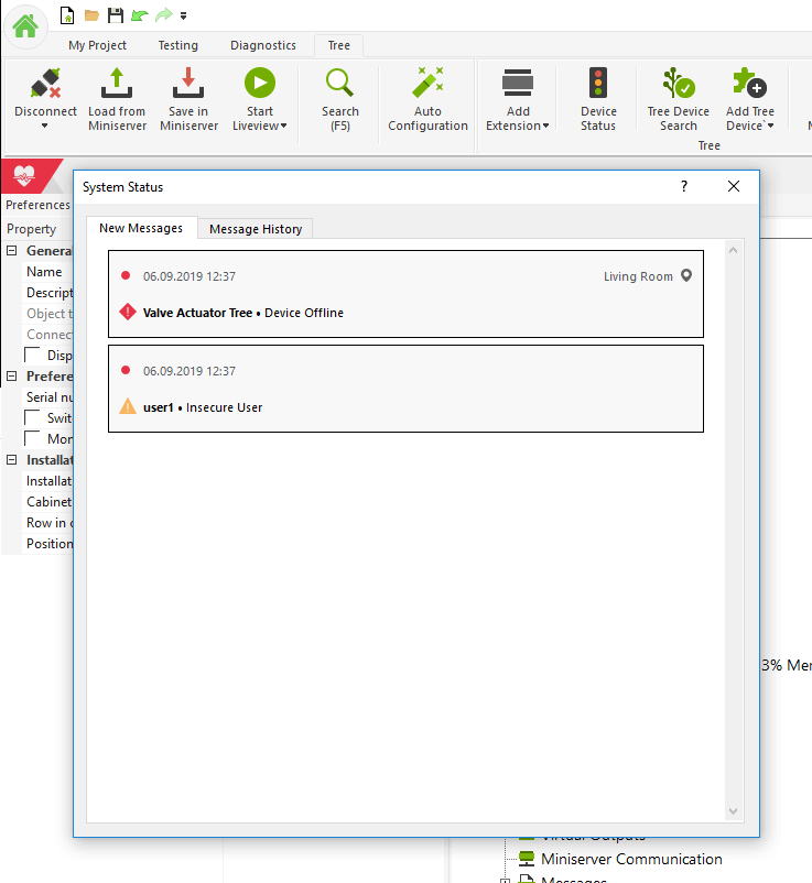 De systeemstatus is een kanaal waar de Miniserver berichten over de huidige status van het systeem kan bundelen. Dit kan eenvoudige en onkritische informatie zijn maar eveneens fouten die onmiddellijke actie vereisen. De individuele berichten bevatten informatie over de oorzaak en de aard van het evenement en bieden ook hulp bij het oplossen van het probleem. De individuele evenementen in het Smart Home worden op verschillende manieren actief aan de bewoners gemeld. Berichten waarvan de oorzaak al is verholpen, worden nog steeds opgeslagen in een berichtgeschiedenis.