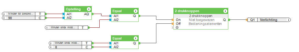 Als de waarden “Minuten sinds middernacht” en “Minuten tot zonsondergang + constante 90” gelijk zijn, staat op ingang On van de programmabouwsteen 2 knoppen de waarde 1 en uitgang Q schakelt in.