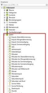 Gebruik daartoe gewoon een van de kant-en-klare tijdcomponenten. In het voorbeeld werd de tijdcomponent “Puls zonsopgang” gebruikt en aan een marker gekoppeld. De marker wordt nu aan alle componenten Automatische jaloezie gekoppeld die bij zonsopgang omhoog moet gaan (op ingang Cu).