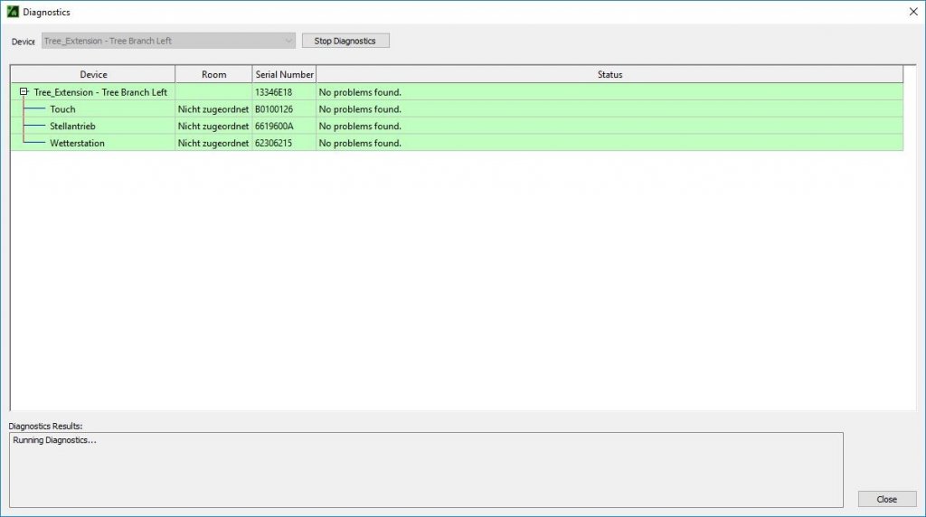 Alle apparaten die op de tree structuur zijn aangesloten, worden hier gecontroleerd. In de diagnose kan worden geselecteerd of de linker- of rechtertak moet worden gecontroleerd.