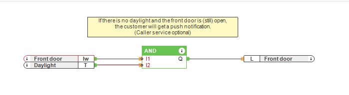 In dit voorbeeld richten we ons op het scenario waarin de bewoner is vergeten de voordeur te sluiten. Een bericht kan worden verstuurd als het bijvoorbeeld donker wordt en de deur nog open is in de zorgwoning.