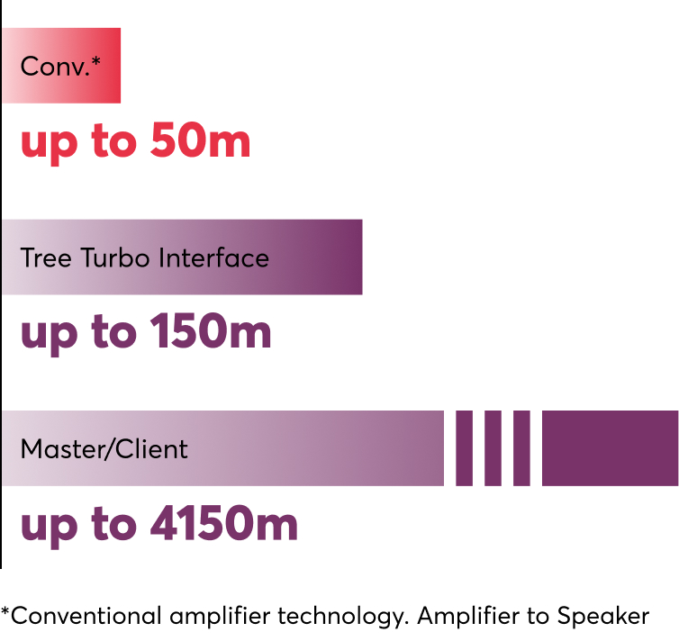 Met de Tree Turbo-interface kunnen maximaal tien Master Speakers worden aangesloten via ster-, lijn-, Tree- of bustopologie. Op elke Master Speaker kunnen maximaal 20 Client Speakers worden aangesloten. De bekabeling tussen Master en Client of van Client naar Client moet via een Daisy Chain gebeuren.
