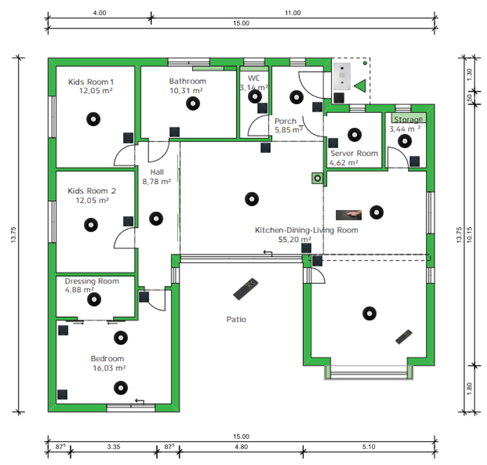 Onze domotica prijs berekenen we aan de hand van bovenstaande voorbeeldwoning. Het gaat om een vrijstaande eengezinswoning van 136m². Binnenin vinden we een open keuken met eetkamer en woonkamer, een bergruimte, een badkamer met apart toilet, twee kinderkamers en een master bedroom met een bijhorende dressing.