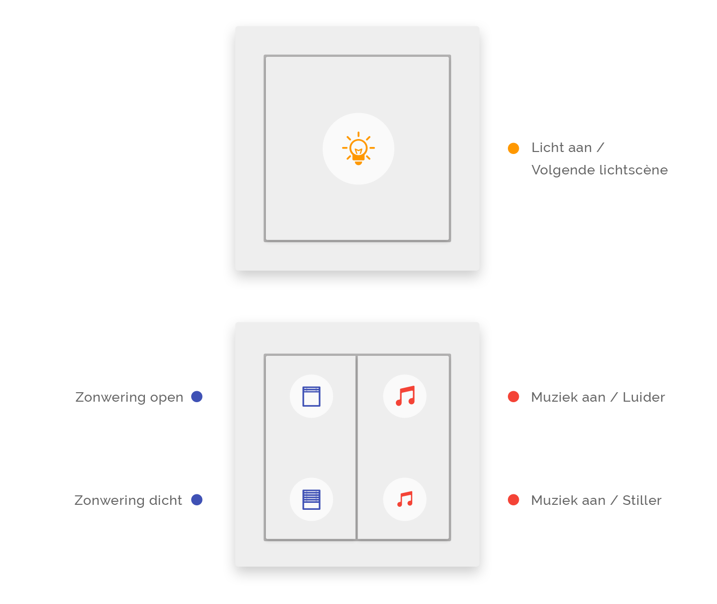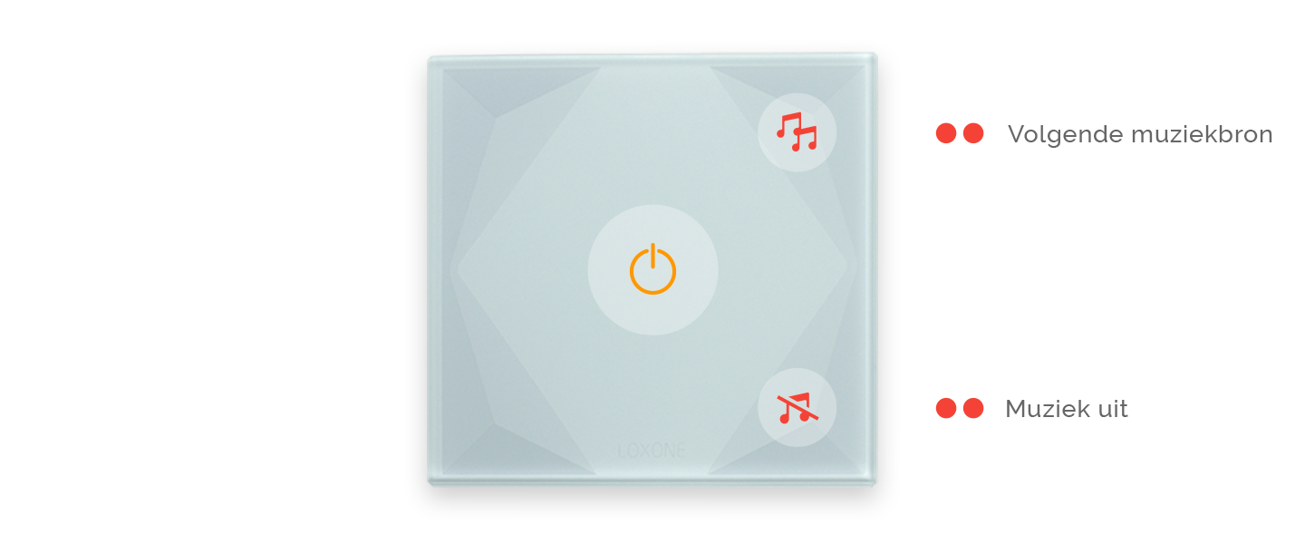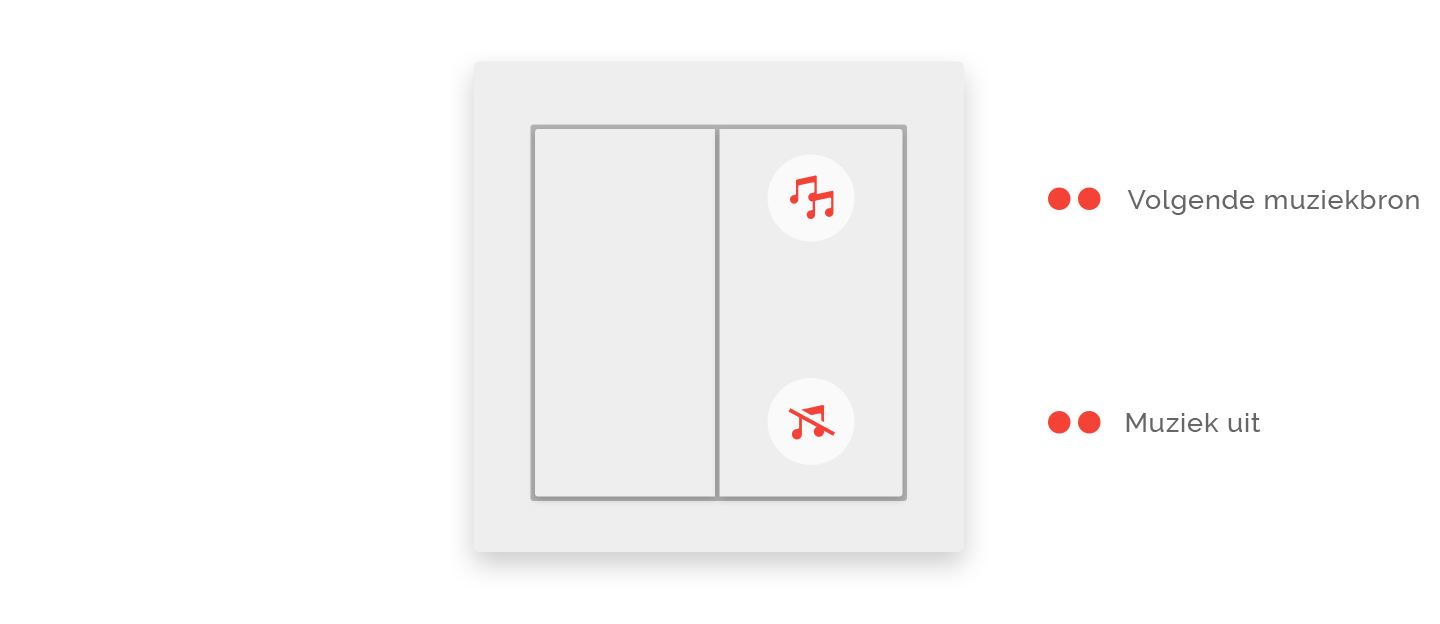 Voor een eenvoudige bediening raden we aan om voor elke domotica drukknop in huis dezelfde functies te gebruiken. Zo bedient u elke kamer op dezelfde manier – zonder na te denken. Dit principe is makkelijk te onthouden en snel aangeleerd, ook voor gasten.