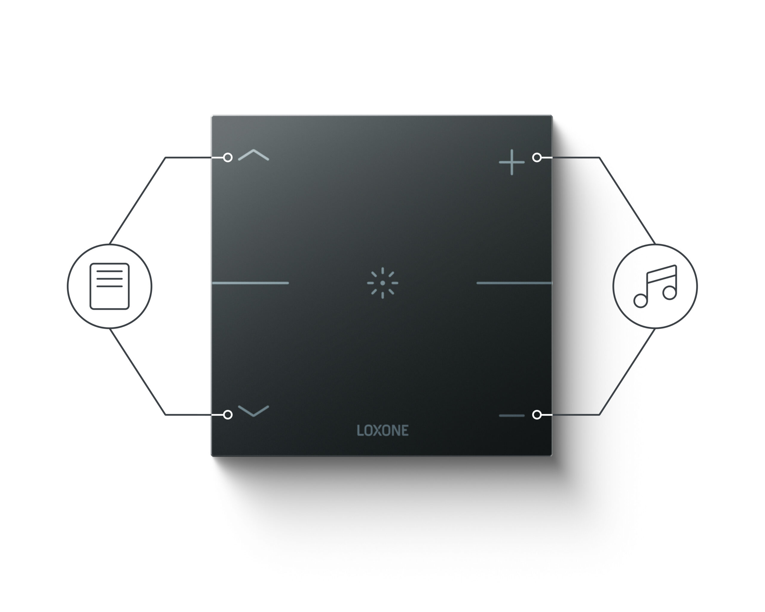 Een aanraking van de grote centrale knop schakelt de verlichting in of verander de lichtstemming. Met de knop in de linkerbovenhoek kun je de zonwering omhoog laten gaan, met de knop in de linkerbenedenhoek laat je deze weer zakken. Aan de rechterkant bedien je de muziek: één klik op de knop bovenaan verhoogt het volume, één klik op de knop onderaan verlaagt het.