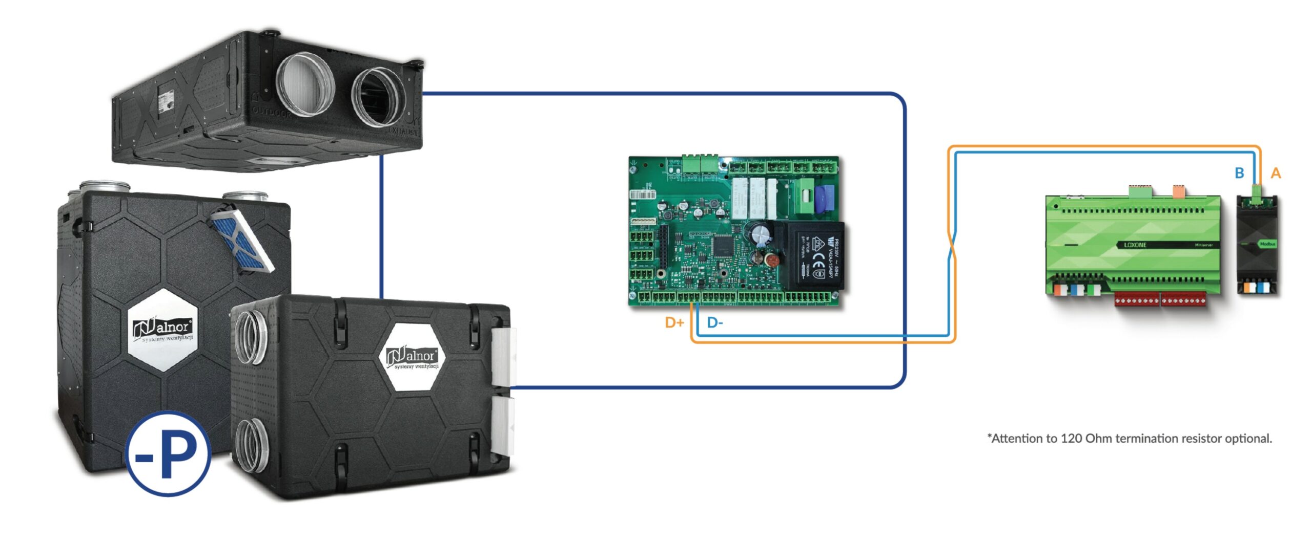 - Bezprzewodowo (Alnor) – przez bramkę HRQ-Modbus, która komunikuje się z rekuperatorem radiowo, a z Loxone przewodowo.