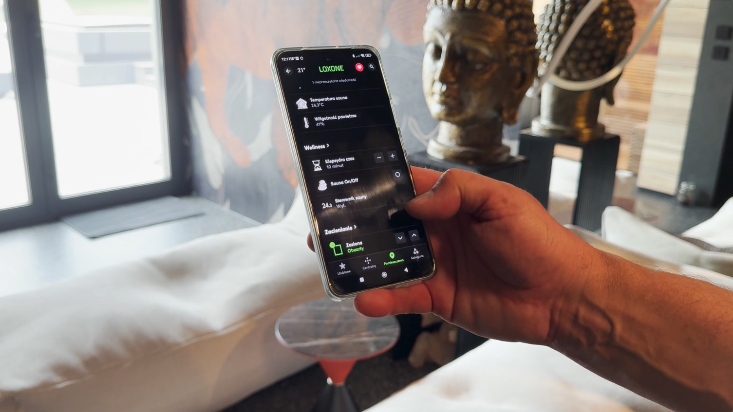 Drugim ciekawym elementem realizacji była modernizacja domowej sauny. Dotychczasowy system oparty o Modbus był zawodny – często się zawieszał i nie współpracował prawidłowo z resztą instalacji. Zdecydowano się na jego całkowite usunięcie i zastąpienie autonomicznie działającym systemem opartym na Loxone.