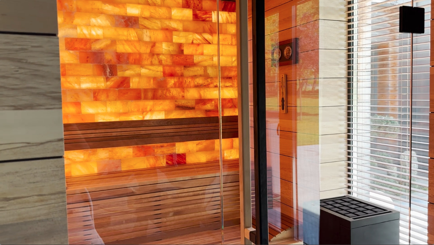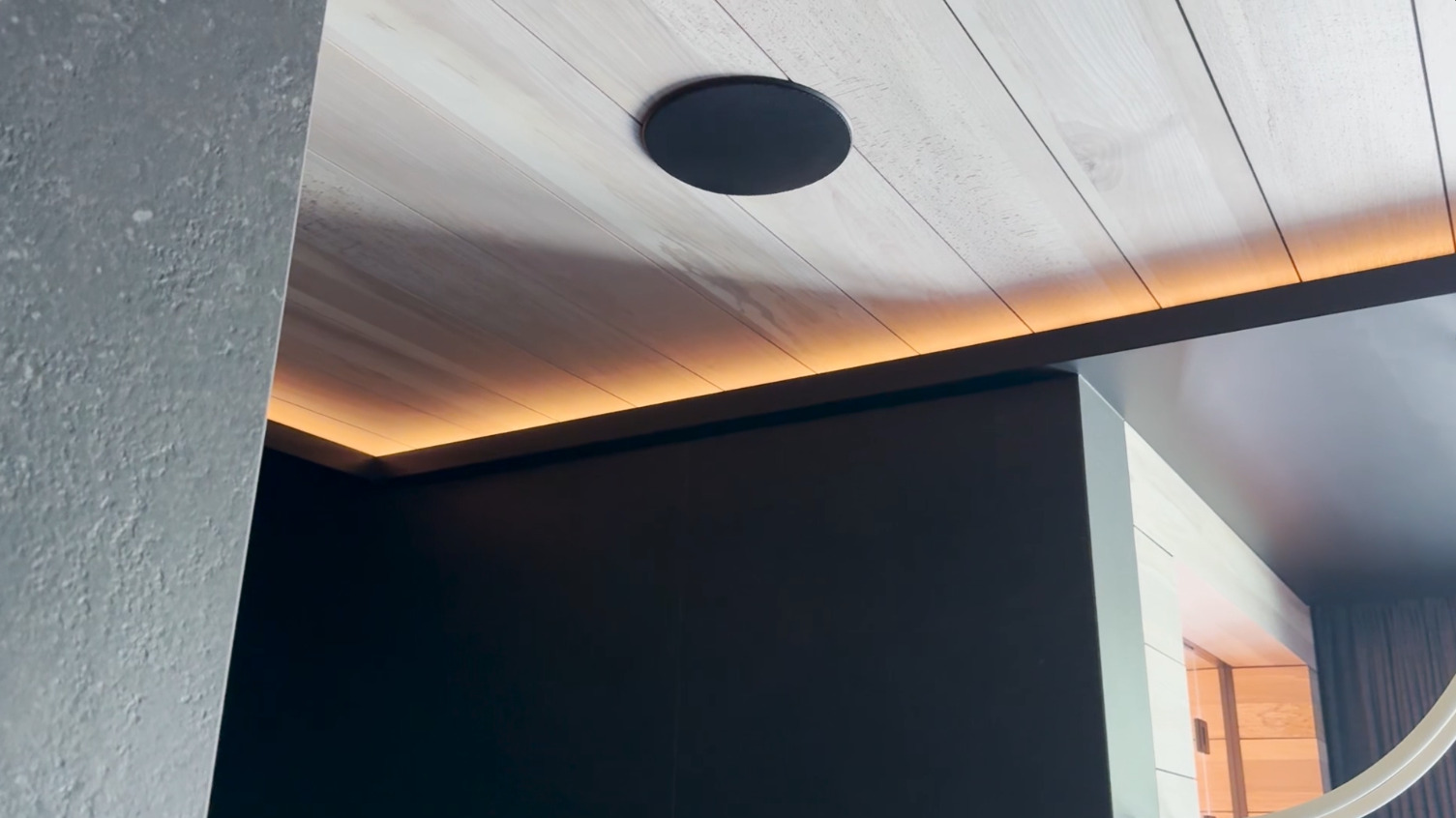 Dodatkowym elementem jest klepsydra programowana przez użytkownika. Po zadanym czasie saunowania światła delikatnie przygasają, a system informuje, że czas relaksu dobiegł końca. To subtelny, ale bardzo praktyczny akcent automatyki.