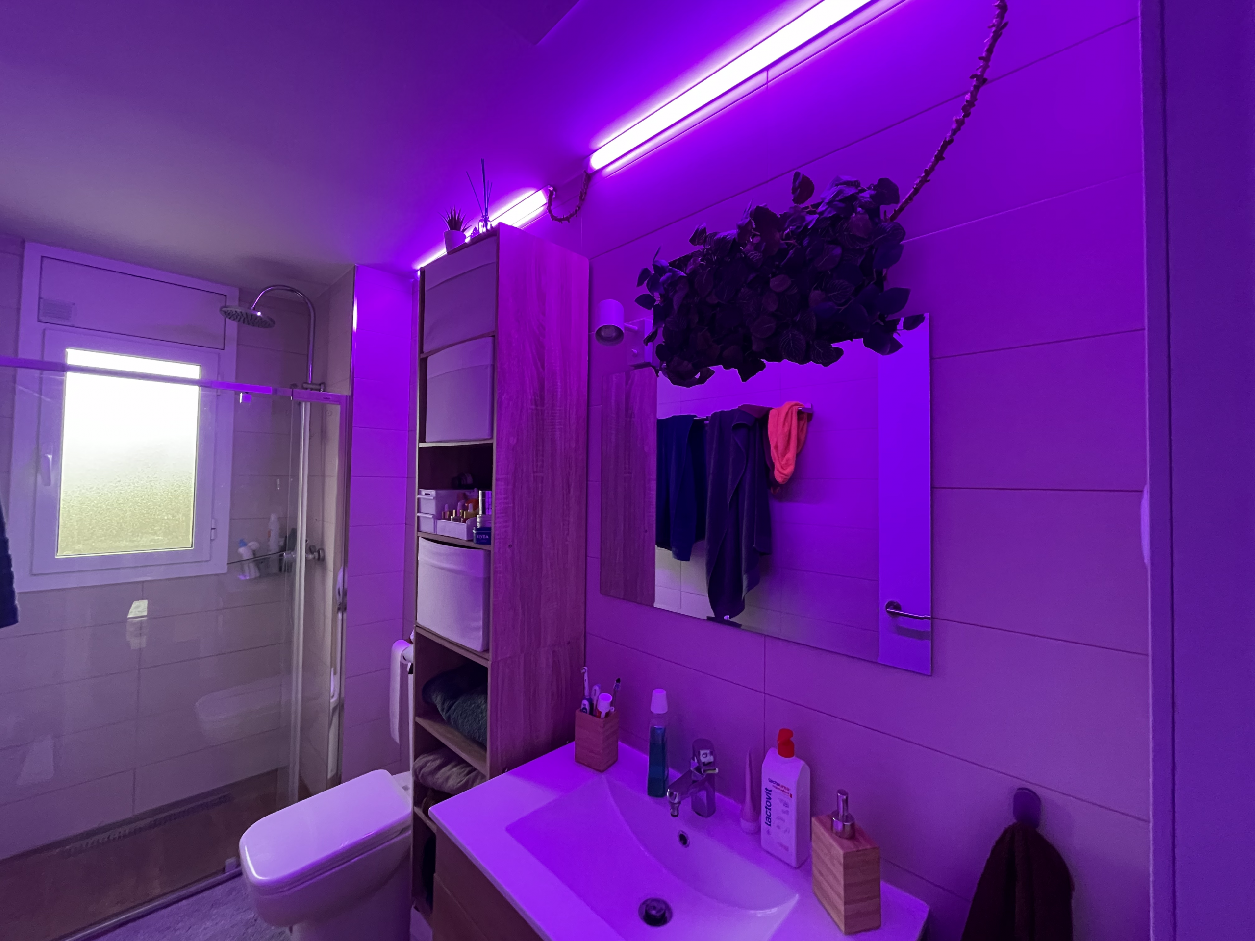 Dobre oświetlenie robi różnicę we wnętrzu każdego budynku. W zależności od sytuacji, będziesz potrzebował takiego czy innego rodzaju oświetlenia. W tym przypadku taśmy LED zostały zainstalowane jako dodatek do tradycyjnego oświetlenia, które dom posiadał już wcześniej. Różne sceny, kolory i intensywność świateł zostały dostosowane do różnych okazji. Dodatkowo, od północy automatycznie włącza się tryb nocny, dzięki któremu wszystkie włączone światła zmieniają barwę na niebieską, tak aby były przyjemniejsze dla oka i mniej przeszkadzały w nocy. Na schodach domu umieszczono dwa czujniki obecności – jeden na górze schodów, drugi na dole, które uruchamiają oświetlenie automatycznie po wykryciu obecności.