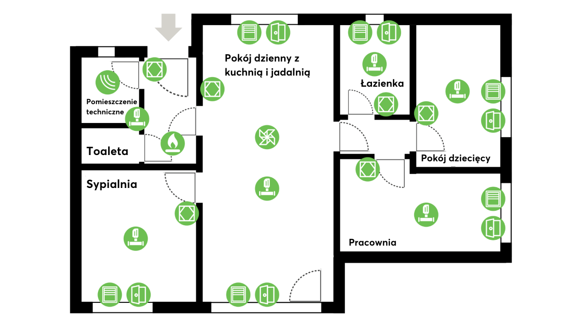 System grzewczy uczy się, jak efektywnie i szybko ogrzać poszczególne pomieszczenia do pożądanej temperatury. Można również ustawić tygodniowe programy grzewcze i monitorować statystyki temperatury wewnętrznej. Jeśli okno zostanie otwarte przez określony czas (system wie o tym dzięki kontaktom okiennym), ogrzewanie wyłączy się samo, aby nie marnować energii. Systemem grzewczym można również zarządzać zdalnie za pomocą aplikacji.