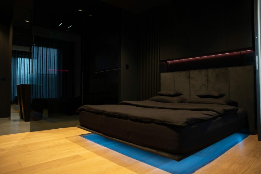 Dzięki całościowej integracji oświetlenia, w mieszkaniu zawsze panuje odpowiednia atmosfera dla danej pory dnia. Wspomniana wcześniej koloroterapia sprzyja regeneracji po długim dniu, a strategicznie rozmieszczone taśmy LED wzmacniają industrialny charakter obiektu. Sterowanie oświetleniem nie mogłoby być prostsze – przyciski Touch Pure, Touch Surface oraz aplikacja Loxone zapewniają właścicielowi stuprocentową kontrolę.