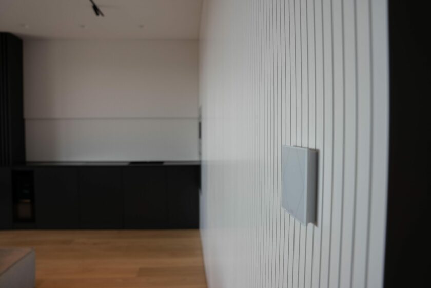 Przed wejściem nasze spojrzenie przykuwa NFC Code Touch, dzięki któremu uzyskamy dostęp do mieszkania, a także umożliwimy go innym osobom, podczas gdy nie ma nas w domu. Czy to zaufany przyjaciel, który podlewa rośliny podczas naszych wakacji, personel sprzątający, a może odwiedzająca nas rodzina – w aplikacji Loxone ustawimy uprawnienia dostępu, a goście bez problemu zameldują się wewnątrz. Dodatkowo zastosowano system alarmowy powiązany z czujnikami obecności oraz kontaktami okiennymi i drzwiowymi, tak aby właściciele mogli spać spokojnie w dowolnym miejscu na świecie.