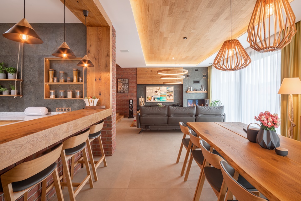 Dom drewniany jest przyjazny dla środowiska, zwłaszcza że został zbudowany w standardzie pasywnym. Jest on sterowany przez inteligentny system Loxone, który czuwa nie tylko nad prawidłową regulacją temperatury i wilgotności wewnątrz, ale także nad oświetleniem i nawadnianiem trawnika w okolicy domu.