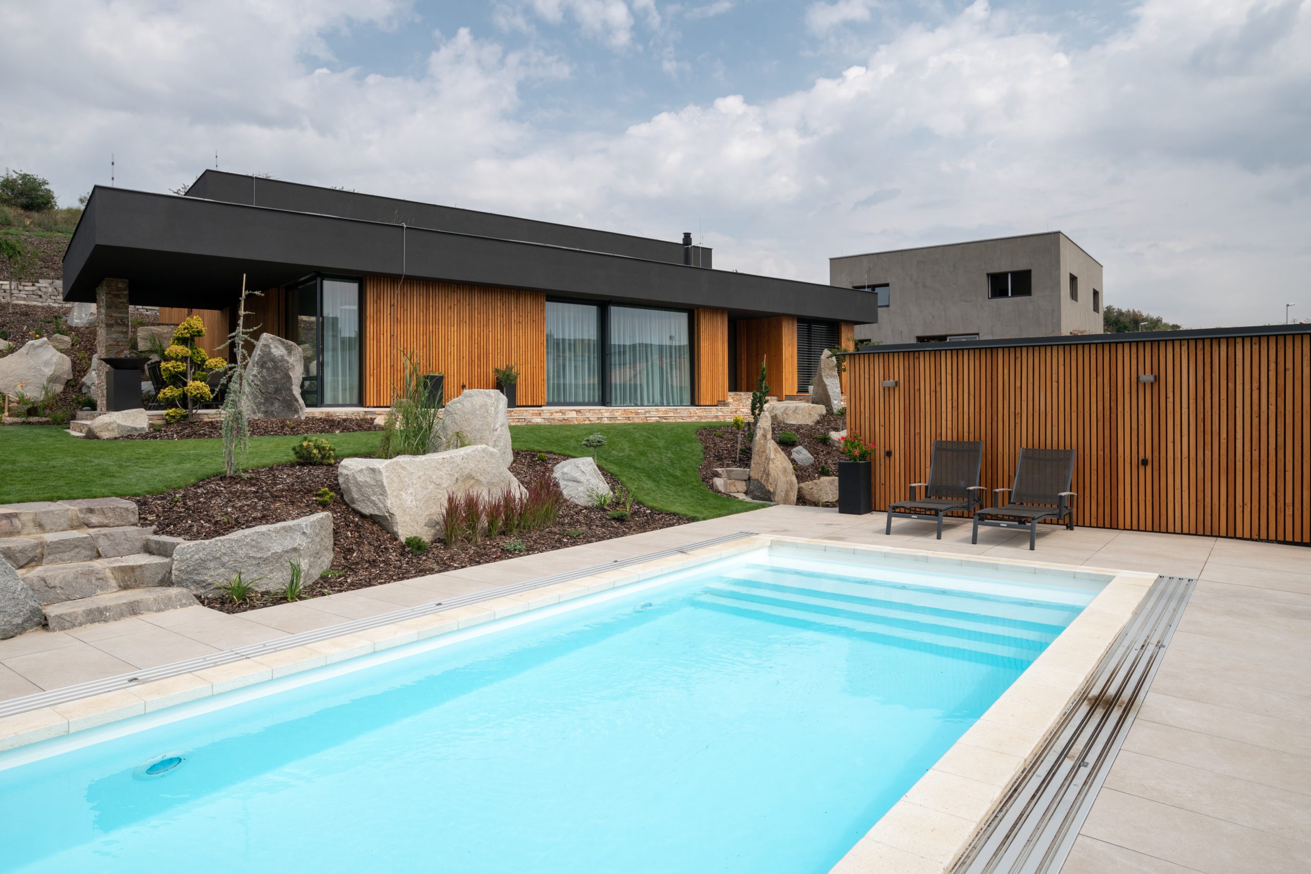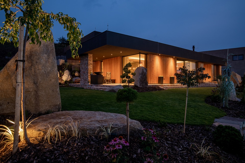 Loxone steruje systemem nawadniania, który współpracuje ze stacją pogodową, dzięki czemu trawa jest stale zielona, a wszystkie rośliny prawidłowo odżywione. Związek z naturą jest widoczny nie tylko z zewnątrz. We wnętrzu główną rolę odgrywa drewno, z którego wykonano nie tylko meble na zamówienie, ale także schody, designerskie oświetlenie oraz okładziny sufitowe i ścienne. W niektórych miejscach jest to połączone z zielenią wertykalną.