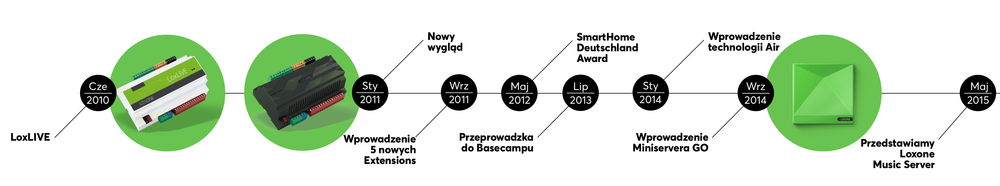 W 2011 roku uprościliśmy nieco mylące nazwy naszych produktów. „LoxLIVE” stał się Miniserverem Loxone, LoxMORE zmienił nazwę na Extension, a LoxPLAN to dzisiejszy Loxone Config. Zwykła, szara obudowa odeszła w niepamięć, a Miniserver otrzymał szlachetną, specjalnie zaprojektowaną i wykonaną obudowę formowaną wtryskowo. Początkowo była w kolorze czarnym. Dopiero w 2013 roku Miniserver Loxone zmienił barwę obudowy na zieloną.