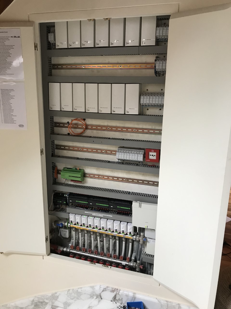 Na zdjęciu jest widoczna rozdzielnica w biurze Loxone. Po lewej stronie widać system Loxone, a po prawej wyłączniki potrzebne do zasilania urządzeń silnoprądowych takich jak gniazdka. Rozdzielnica jest tak mała, ponieważ według naszych standardów zawiera tylko Miniserver, Audioserver, kilka zasilaczy i wyłączników. Wszystkie pozostałe urządzenia są ukryte w sufitach podwieszanych i puszkach instalacyjnych.