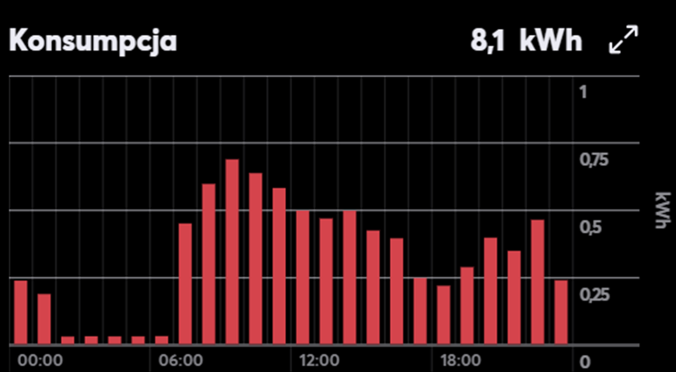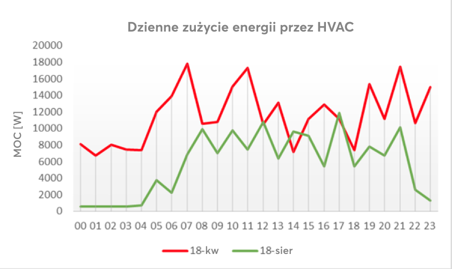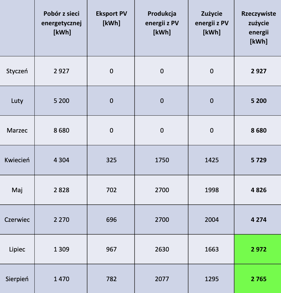 Należy również uwzględnić fakt, że w lipcu i sierpniu mieliśmy wiele ciepłych dni z temperaturami powyżej 28°C. Oznacza to, że klimatyzacja była używana intensywniej niż w miesiącach wiosennych, a mimo to zużycie energii elektrycznej jest wyraźnie niższe.