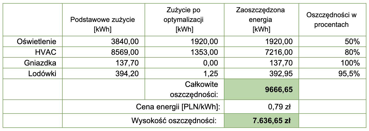 Tabela 1 pokazuje rzeczywiste korzyści finansowe, jakie jesteśmy w stanie osiągnąć dzięki optymalizacji w ciągu roku.