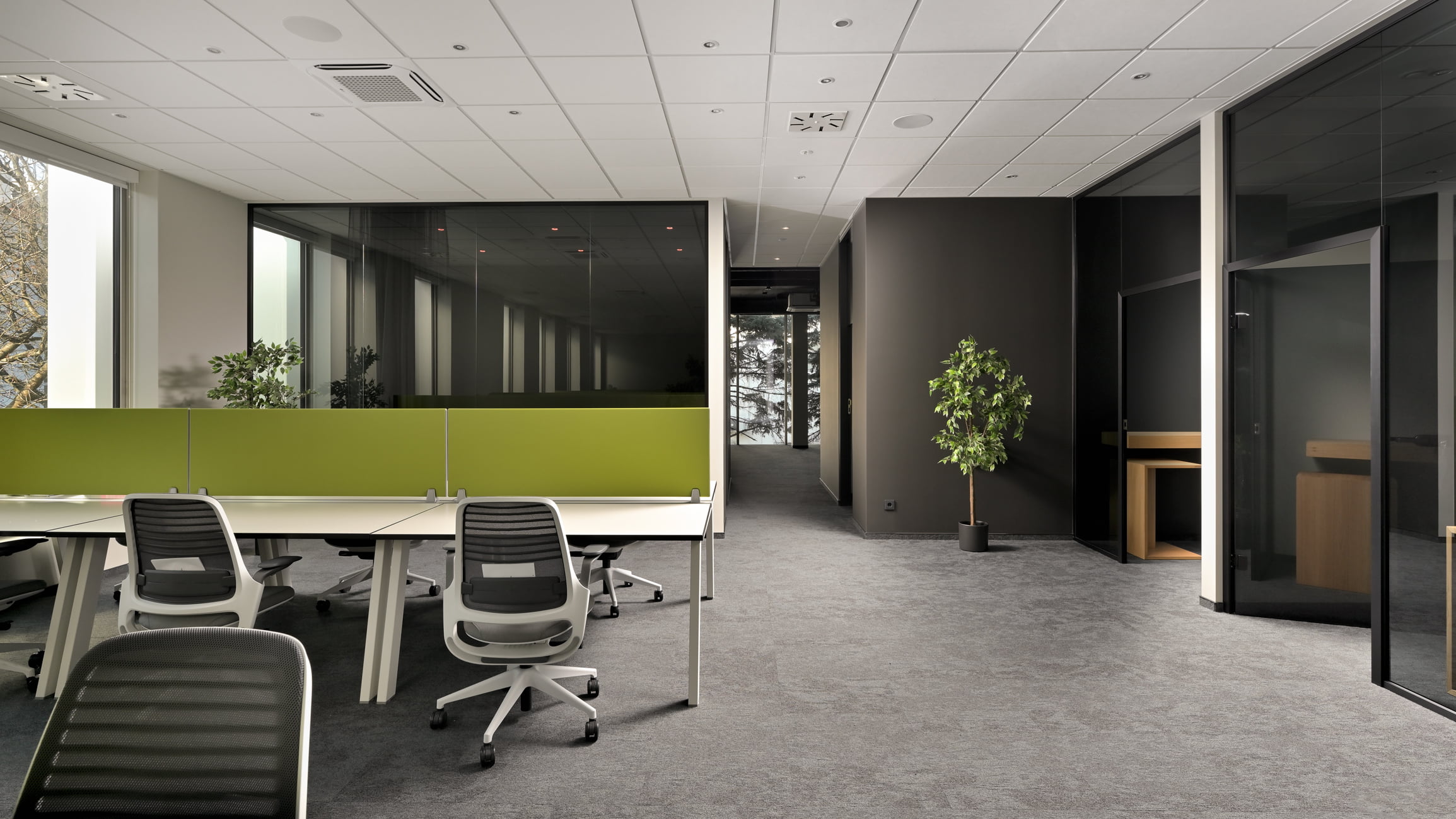 Nasze oświetlenie bazuje na wykrywaniu obecności w pomieszczeniu i natężeniu światła naturalnego. Standardowe oświetlenie stosowane w biurach jest zawsze włączone w godzinach pracy i nie posiada możliwości ściemniania.