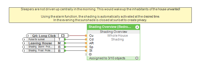 Za pomocą bloku funkcyjnego ‘Centralne zacienienie’ można łączyć drzwi i okna w grupy. Zaleca się rozróżnienie między salonem a sypialnią. Na życzenie klienta można również utworzyć kilka grup. Oddzielne grupy są konieczne, aby funkcja prywatności nie była jednocześnie aktywowana i dezaktywowana w całym domu.