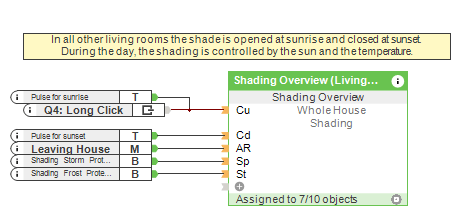 W momencie, kiedy wszystkie okna i drzwi są połączone za pomocą bloków funkcyjnych, można użyć czasu „impuls zachodu słońca” w drzewie peryferii , aby zasłonić okna przy zachodzie słońca.