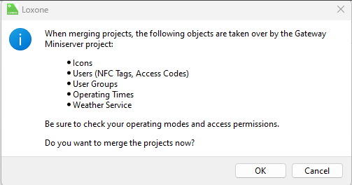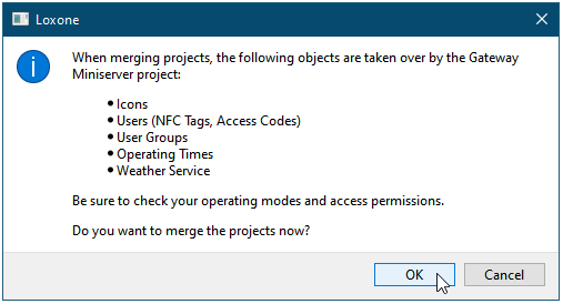 Wybrany projekt zostanie teraz połączony w Loxone Config z projektem już otwartego Miniservera. Zostanie on automatycznie utworzony jako klient.