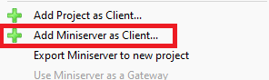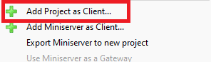 W drzewie peryferyjnym klikamy prawym przyciskiem myszy na Miniserver i z menu kontekstowego wybieramy „Dodaj projekt jako klient”:
