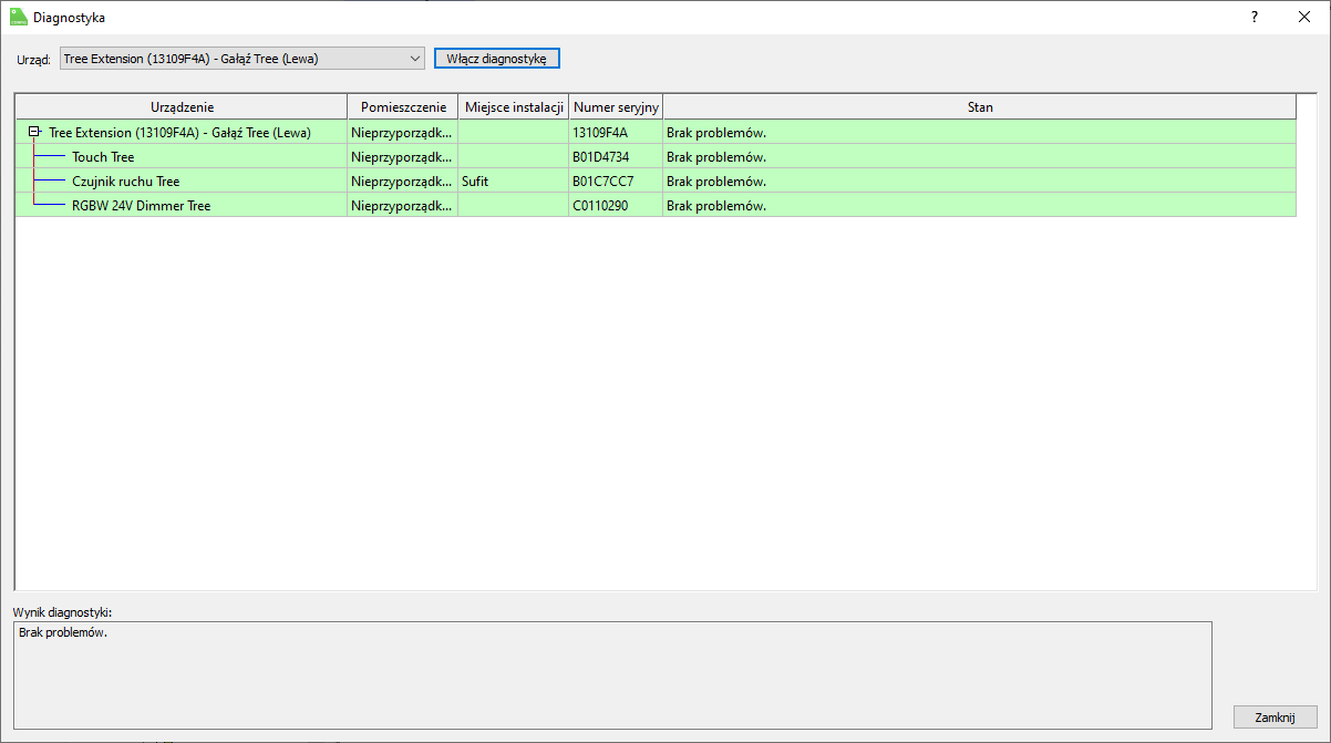 Tutaj sprawdzane są wszystkie urządzenia podłączone do rozszerzenia Tree. Podczas diagnozy możesz wybrać, czy lewa czy prawa gałąź ma być sprawdzana.