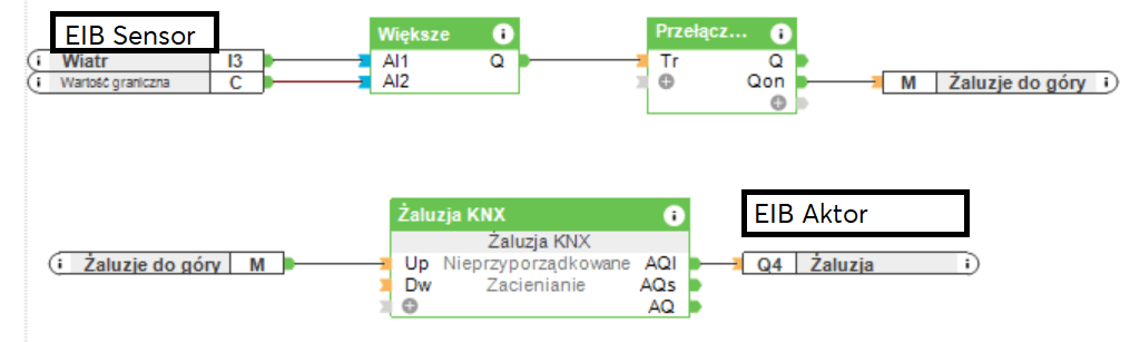 Przykładowy monitor wiatru z czujnikiem EIB prędkości wiatru, komparator i blok Żaluzji KNX