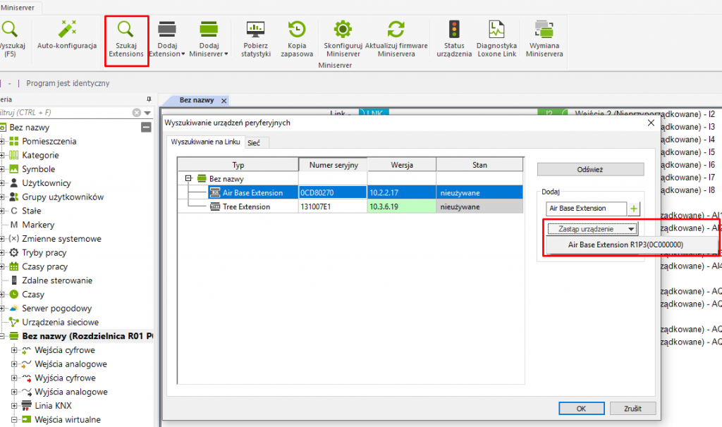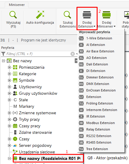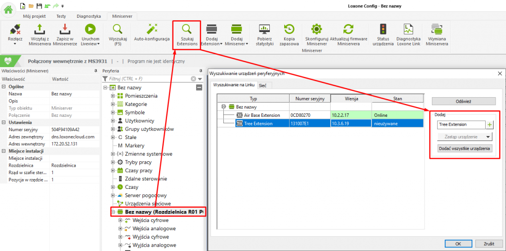 Istnieje jednak możliwość dodania rozszerzenia do programowania bez jego fizycznego połączenia. Połącz się z Miniserverem i załaduj program, jeśli jest wgrany w Miniserverze. Następnie w zakładce „Miniserver” znajdź przycisk „Dodaj Extension”. Jego naciśnięcie spowoduje rozwinięcie się menu z rozszerzeniami, które możesz dodać. Numer seryjny można wypełnić później we właściwościach.
