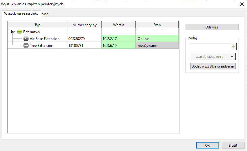 Podłącz nowe urządzenie i kliknij „Szukaj Extensions”. Stare urządzenie będzie w stanie „Offline”. Nowy w stanie „Nieużywane”. Kliknięciem wybierz nieużywane rozszerzenie a w rozwijanym menu „Zastąpić urządzenie” wybierz to, które chcesz zastąpić. Na koniec kliknij „OK”. Rozszerzenie zostało zastąpione.