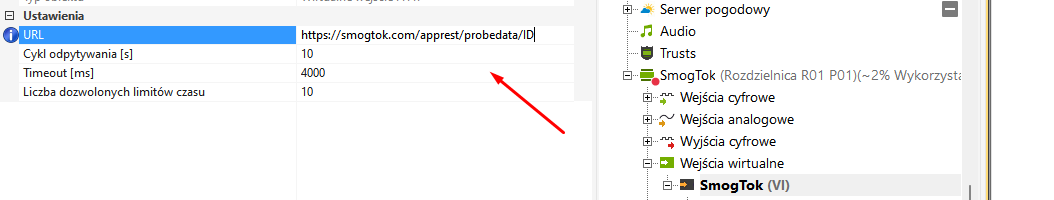 2. W polu URL wstaw adres odpytujący dane z lokalnego czujnika.