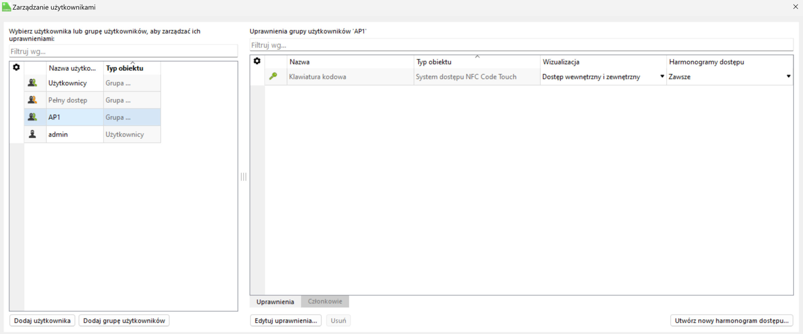 1. Stworzenie grupy użytkowników dla każdego apartamentu (np. AP1, AP2…) z prawem do klawiatury kodowej NFC